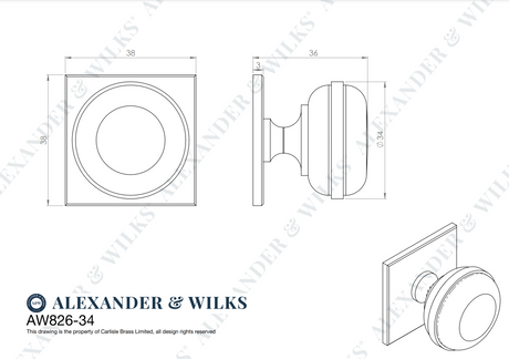 Alexander and Wilks 34mm Quantock Antique Brass Cupboard Knob on Square Backplate