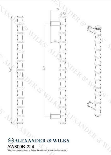 A&W Antique Brass Bamboo T Bar Pull Handle c/c 224mm AW809B-224-AB