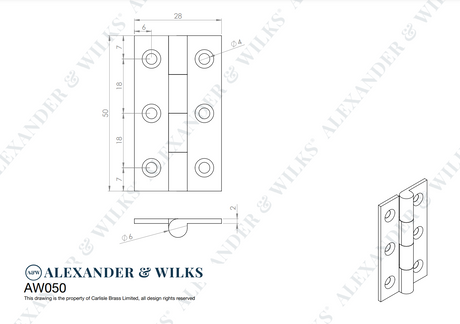 Pair Pewter 50mm Cabinet Butt Hinge | AW050-CH-PWT
