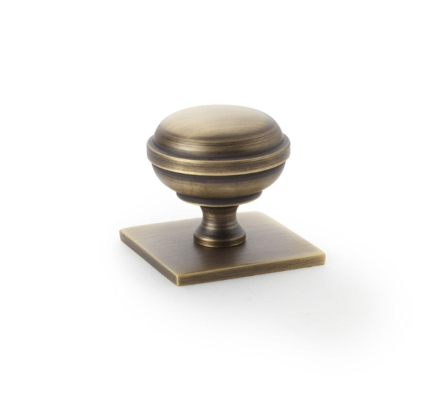 Alexander and Wilks 34mm Quantock Antique Brass Cupboard Knob on Square Backplate