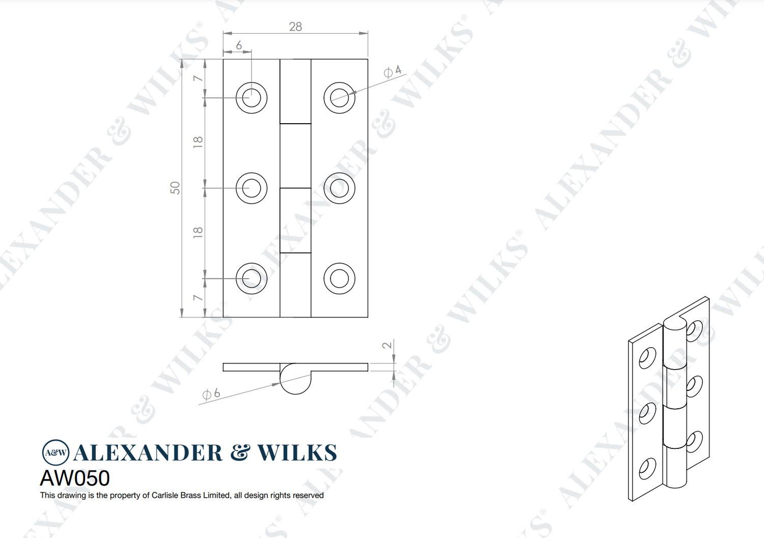 Pair Pewter 50mm Cabinet Butt Hinge | AW050-CH-PWT